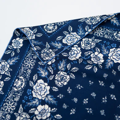 Last Chance Textile's classic rosey floral gets glam with a version in silk twill. Double-sided printing give these extra versatility to style in countless ways and each one is finished with an elegant hand-sewn rolled hem. It meets high ethical and environmental standards including SMETA 4 Pillar, GOTS, and Oeko-tex® Standard 100 certifications.