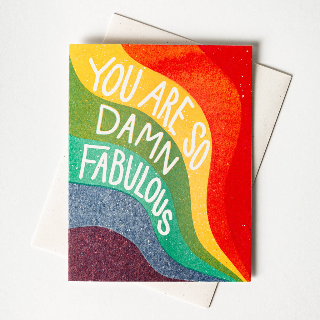 A fun wavy rainbow delivers the message: You are so damn fabulous! Risograph printed in bright red, sunflower yellow, seafoam and federal blue ink.