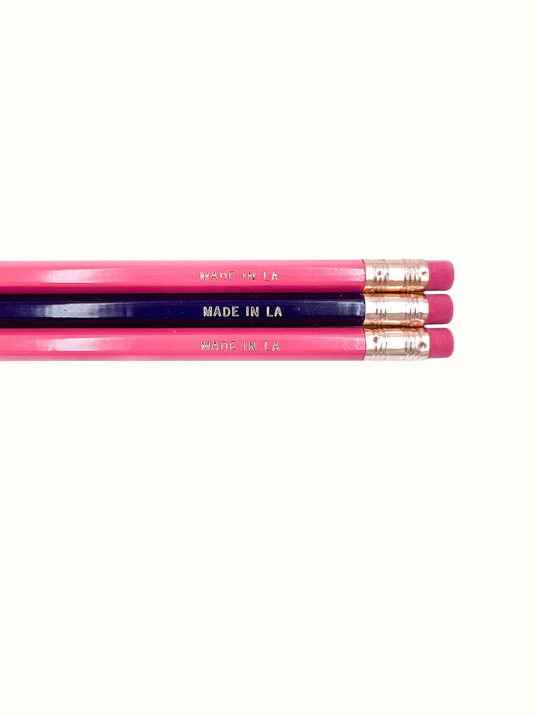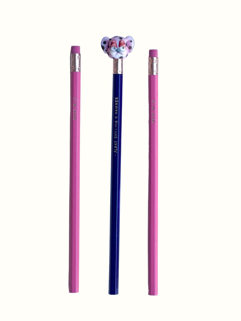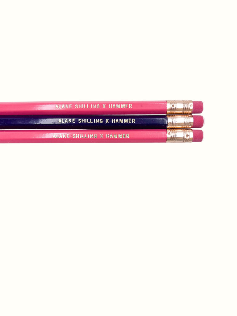 Set of three pencils: 2 pink pencils and 1 purple pencil. Engraved with Made in LA and Alake Shilling x Hammer on opposite side
