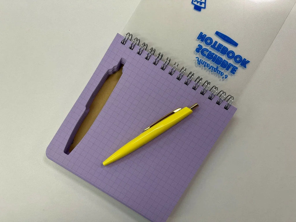 80 page spiral notebook with mini-ball pen stored within a cut-out in the pages (a clever transparent first page keeps the pen from falling out). Elastic closure. 5" square size. Colorful pages gridded on both sides. Mini ball pen uses refill ATR-BP10.