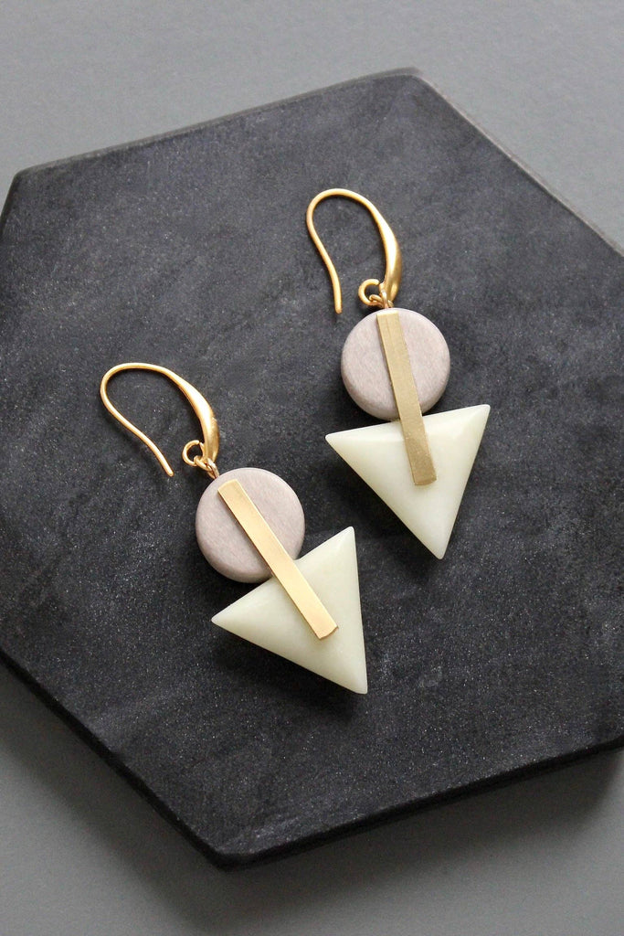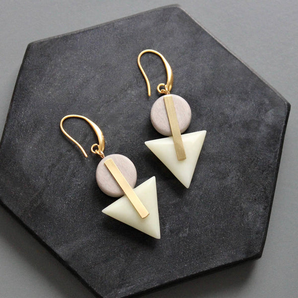 18k gold plated brass hooks with wood and jade. Each earring weighs .17 oz. and measures 2.25 inches in length from top to bottom.