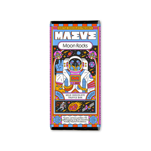 Houston, we have a problem. Maeve spilled popping candy into chocolate. Actually, Houston? It's delicious. Perfect for all astronauts and space fans! Flavor: Creamy milk chocolate with all natural popping candy.